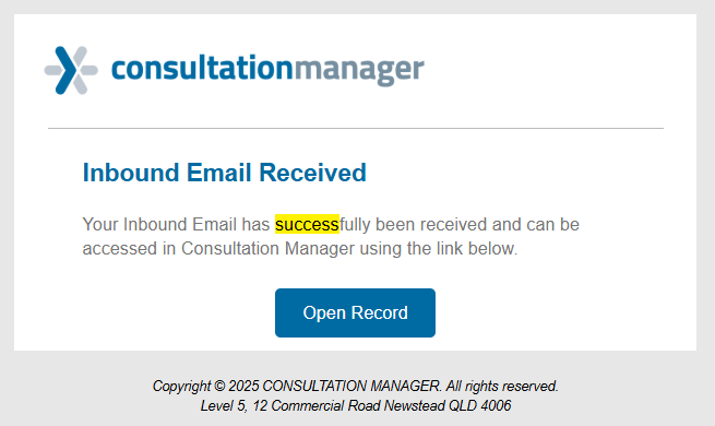 The User will receive a confirmation email to notify them that the email has been received, including a link to view all emails that have been sent in.