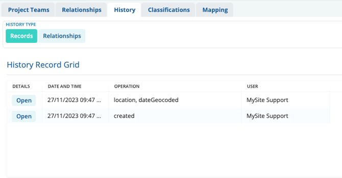 On the Relationships tab, you can see a related dock for each Record type. These related docks display all Records which are related to the Project.