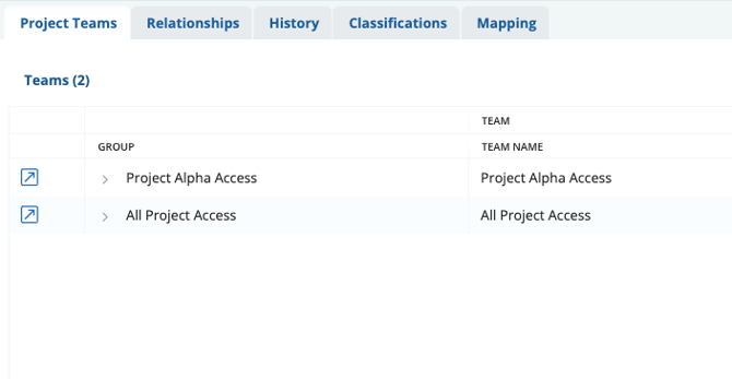 This tab is the default tab in the Project Record and shows all the Teams that have access to the Project. These can be expanded to see which Users are in each Team.