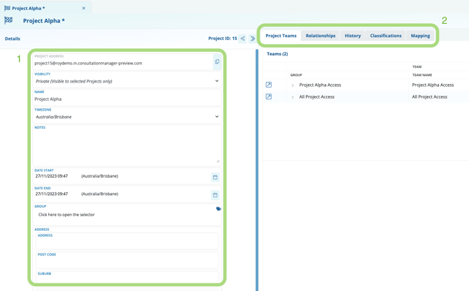 On the left-hand side (1), you can edit the name of your Project, Project Time Zone and the Project Groups as well as any other details you are tracking.